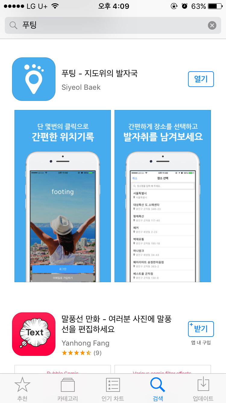 한 번의 실패를 경험하고 난 후라 신중하게 여러 아이디어를 고민하던 중 우연히 들린 성수동의 매력에 푹 빠졌었던 당시 내가 있는 위치를 기록해두고 다음에 또 찾고 싶다는 생각에서 위치기반 SNS '푸팅'을 떠올렸다. 간단하게 내가 있는 위치를 기록하고 사진, 코멘트 등을 남겨서 지도를 하나의 방명록처럼 이용하고 싶었고 나는 이 아이디어를 팀원들에게 공유했다. 모두 아이디어에 대해 좋은 반응을 보였고 우리는 바로 기획 해커톤을 시작했다. 24시간 동안 우리는 열띤 토의를 하며 빠른 시간 내에 기획을 정리했고 단계적인 개발 계획을 수립했다. 한 번의 실패를 경험한 후라서 그런지 우리는 조금 더 신중했고 최대한 실패하지 않기 위해 많은 노력을 했다. 우리 팀원들 모두 본업이 있었지만 퇴근 후 혹은 주말에 시간을 내어 개발에 열중했고 최초 버전의 서비스를 개발했다. 하지만 테스트하는 과정에서 우리의 제품이 많이 부족하다는 것을 느꼈고 기획을 재 정비하고 프로젝트를 처음부터 다시 시작했다. 그렇게 처음 아이디어를 공유한 지 약 1년가량 지났을 때 우리는 비로소 서비스를 스토어에 등록했다. 물론 완벽한 기능을 갖춘 상태는 아니었고 최소한의 기능(MVP) 상태의 서비스를 내놓았다.