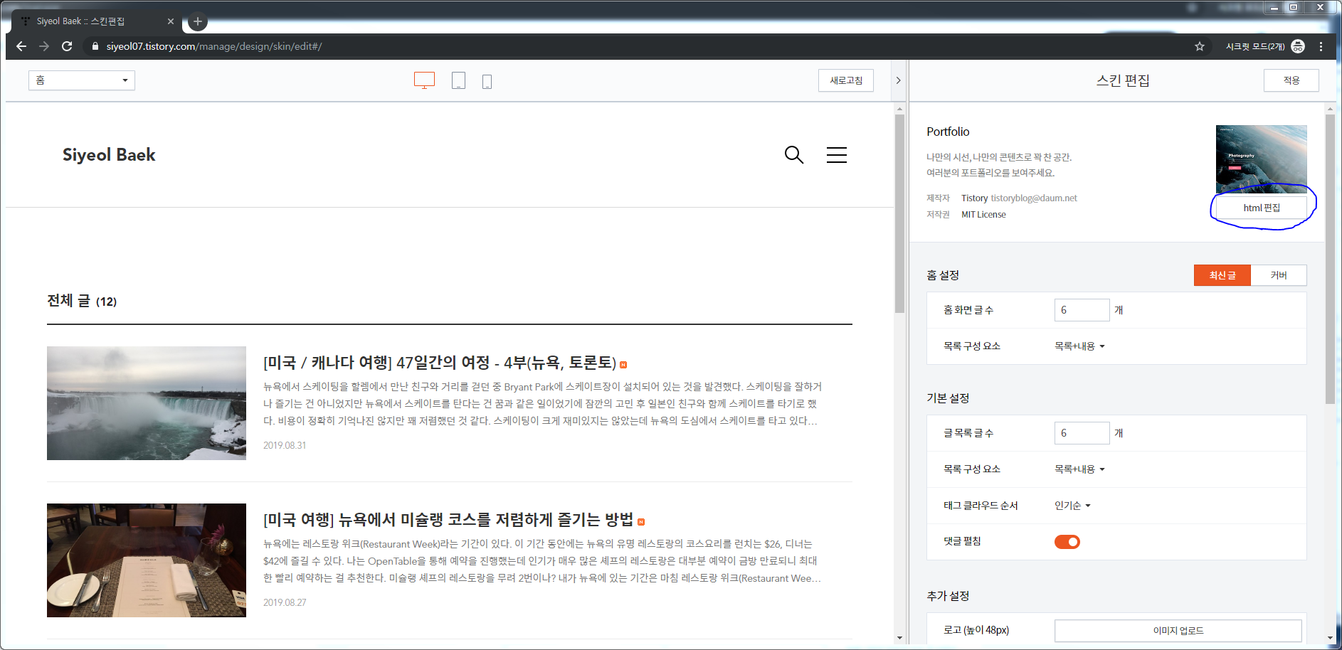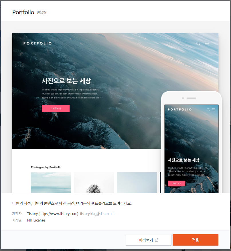 ※ 본 게시물은 티스토리에서 제작 한 Portfolio 스킨을 기준으로 작성되었습니다.