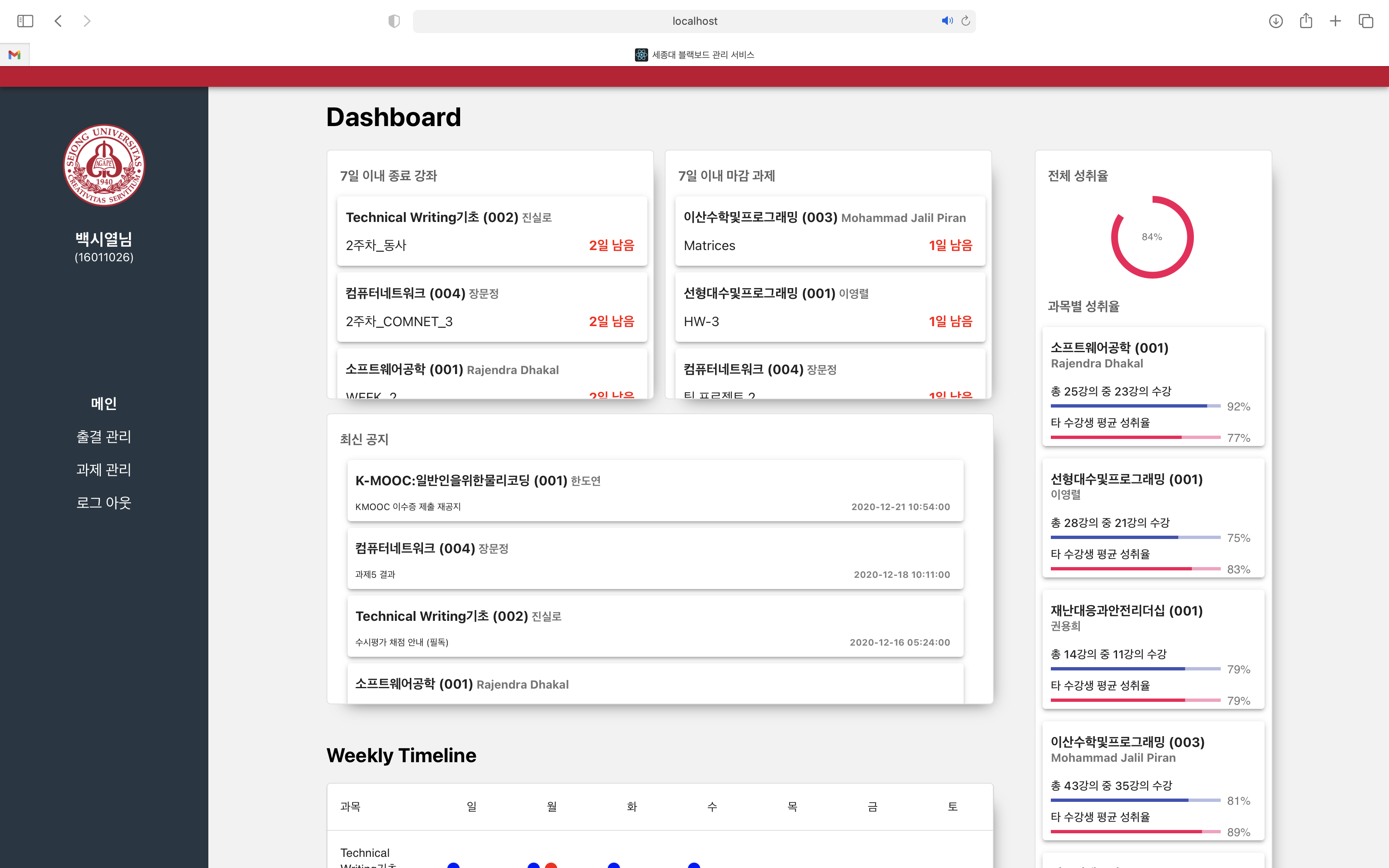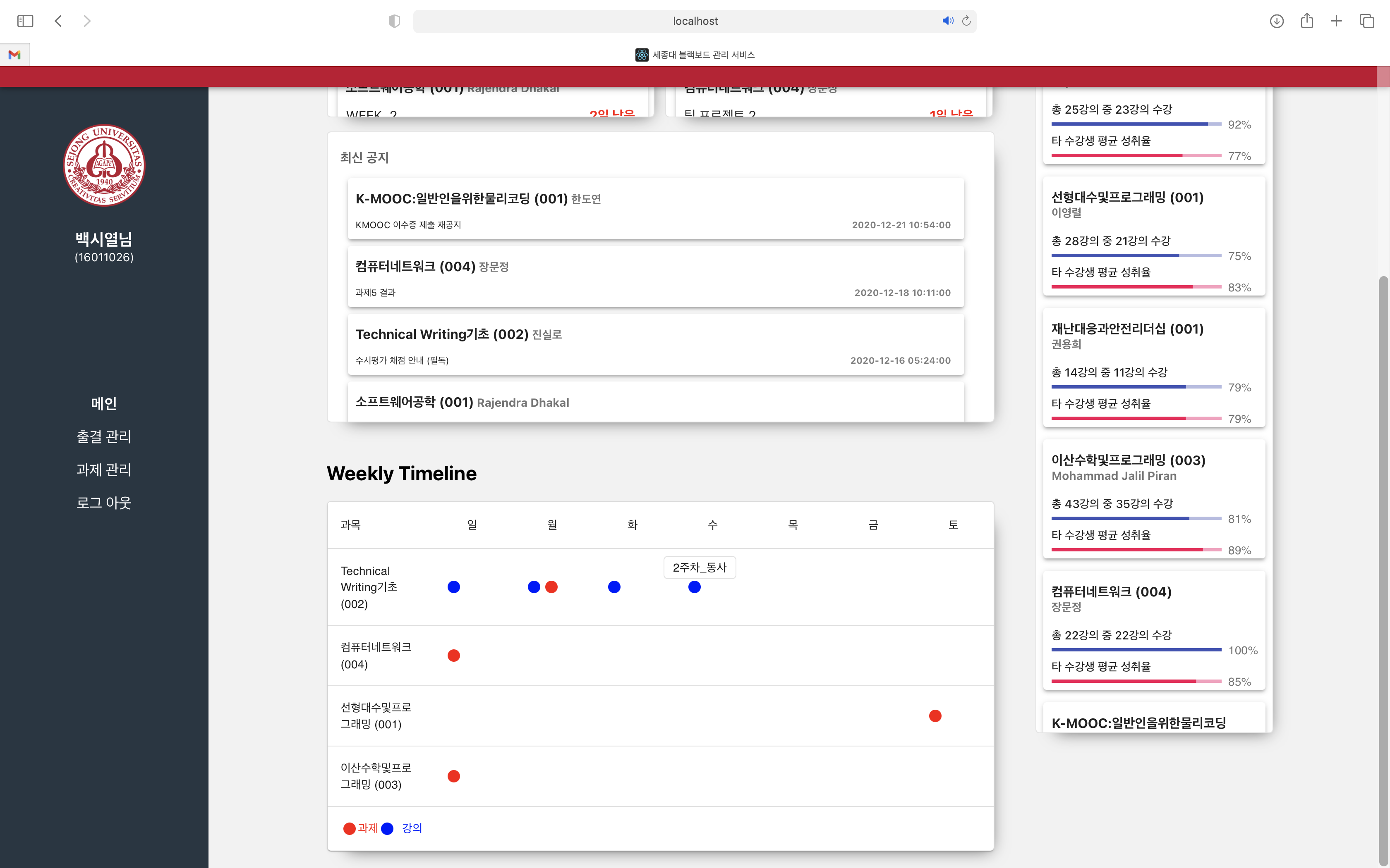 기존 블랙보드 서비스는 각 과목의 출결을 확인하기 위해서는 모든 과목을 일일이 들어가서 확인해야 하는 불편함이 있었고 이를 개선하기 위해 출결을 하나로 모아서 보여주는 것으로 기획을 시작했습니다. 그렇게 가져올 수 있는 데이터를 모으다 보니 꽤 의미 있는 결과가 나오겠다 생각했고 서비스 초입인 대시보드에서 한눈에 필요 정보를 확인할 수 있도록 대시보드 설계에 노력을 기울였습니다. 그 덕분에 아주 만족스러운 결과를 도출할 수 있었습니다.